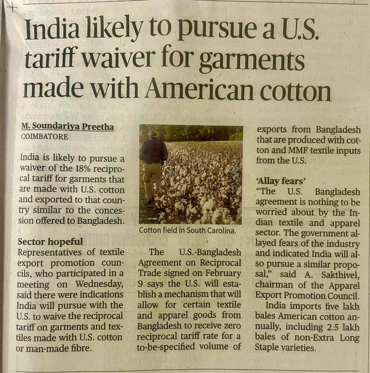 India likely to pursue a U.S. tariff waiver for garments made with American cotton – source ICF Data Base Post date February 20, 2026 ← Cotton Corporation cuts fibre prices by up to3% to spur sales – source ICF Data Base → BREMEN COTTON 19-02-2026
